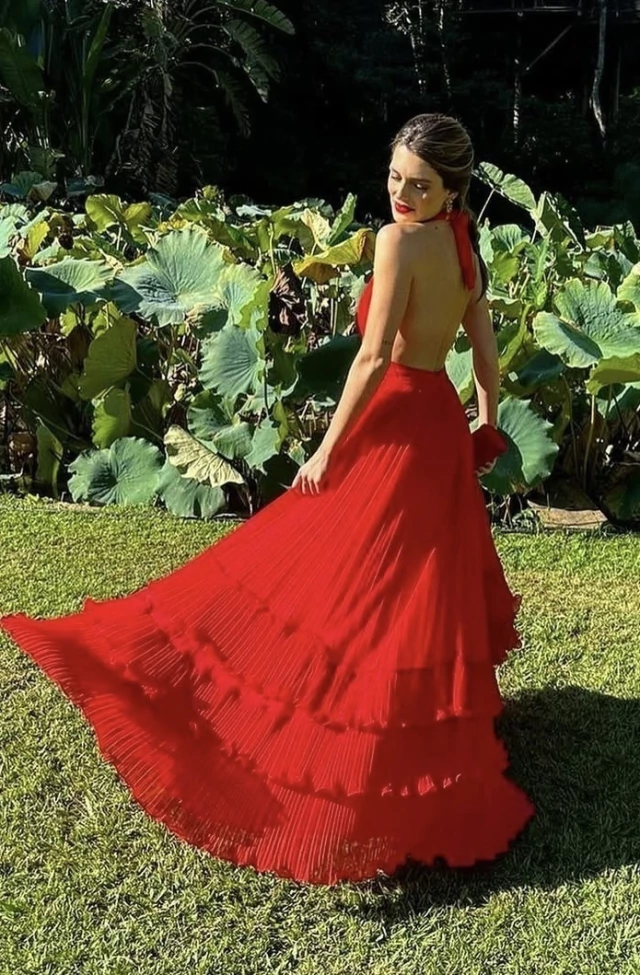Vestido longo em vermelho intenso, com design marcante e sofisticado, perfeito para ocasiões especiais. O modelo possui decote em V elegante, que alonga a silhueta e valoriza o colo.