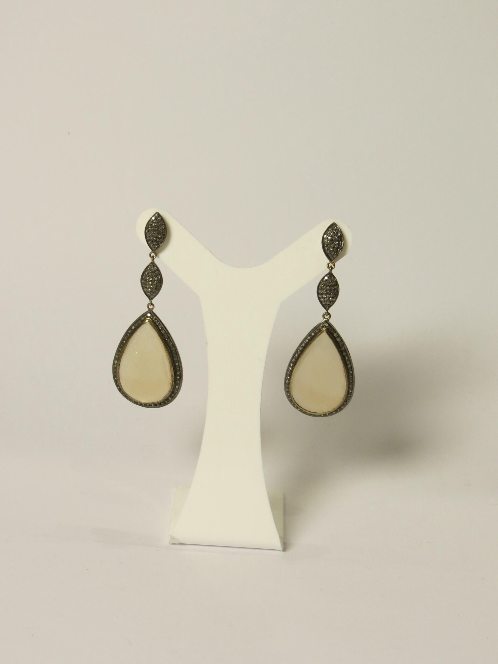 Brinco com base em ródio negro e pedra nude. A peça possui 8 cm de comprimento