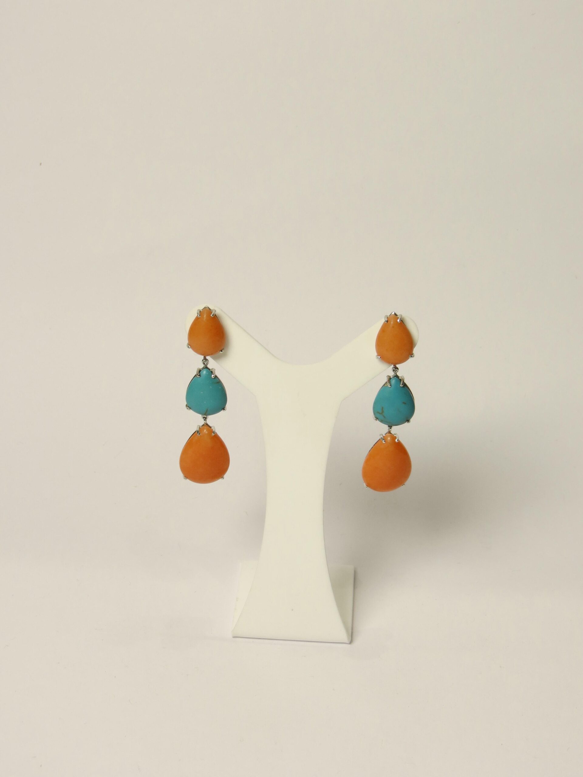 Brinco de base prata, com pedras em coral e turquesa. A peça possui 7 cm