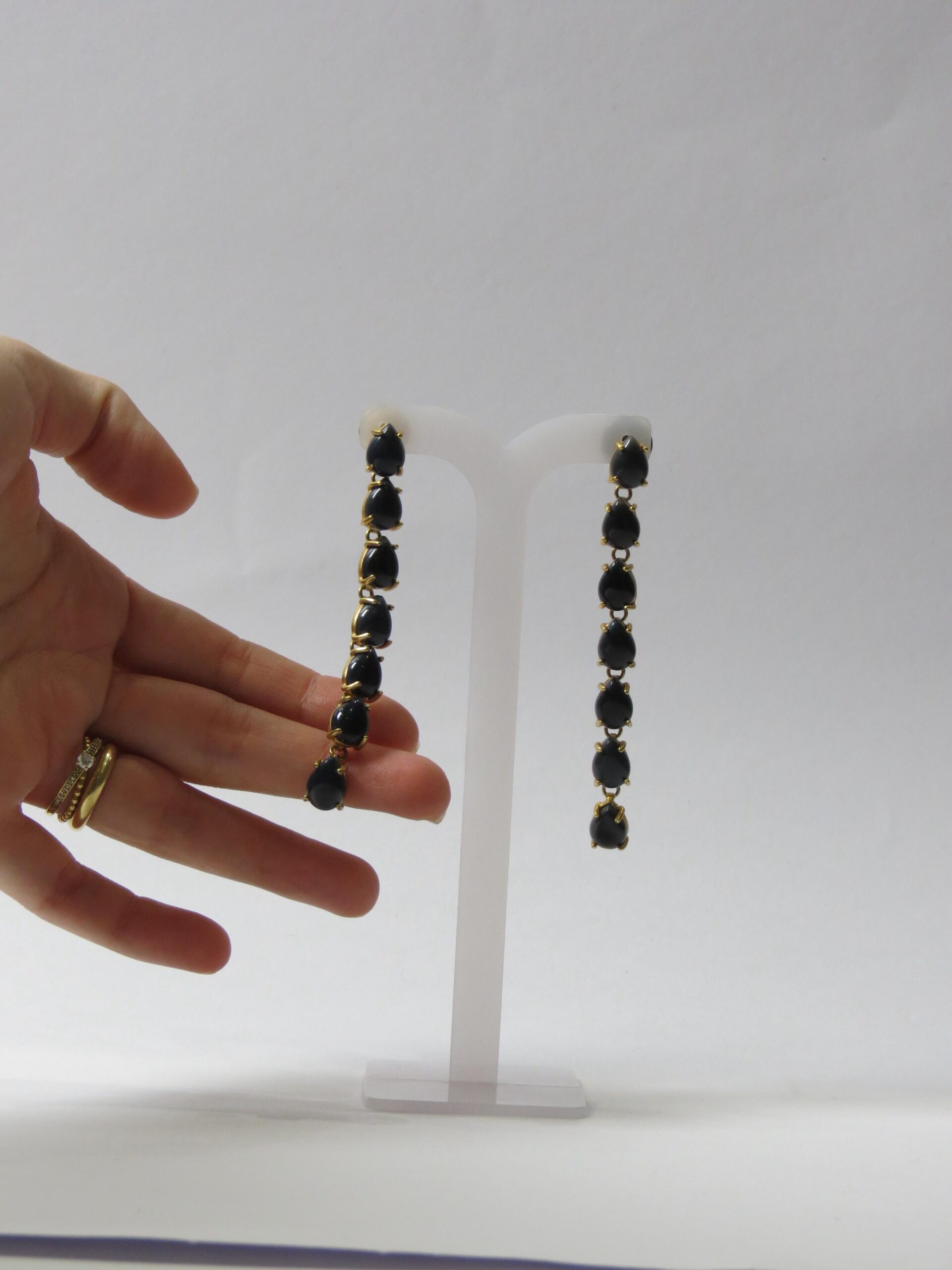 Brinco longo, com 8 cm, feito por pedras em tom de azul marinho por inteiro.