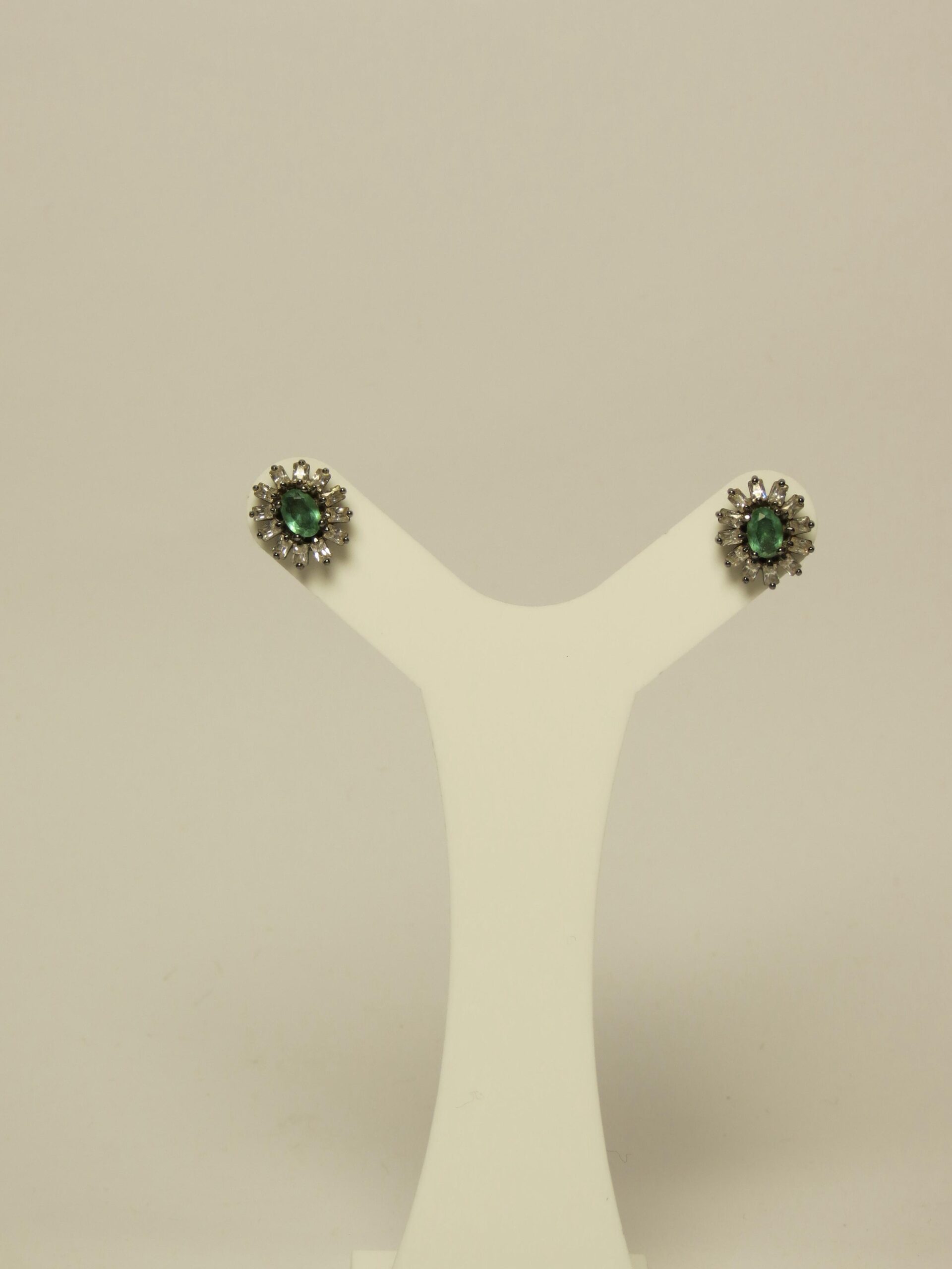Brinco pequeno, com base de ródio negro, brilhantes e pedra verde no centro