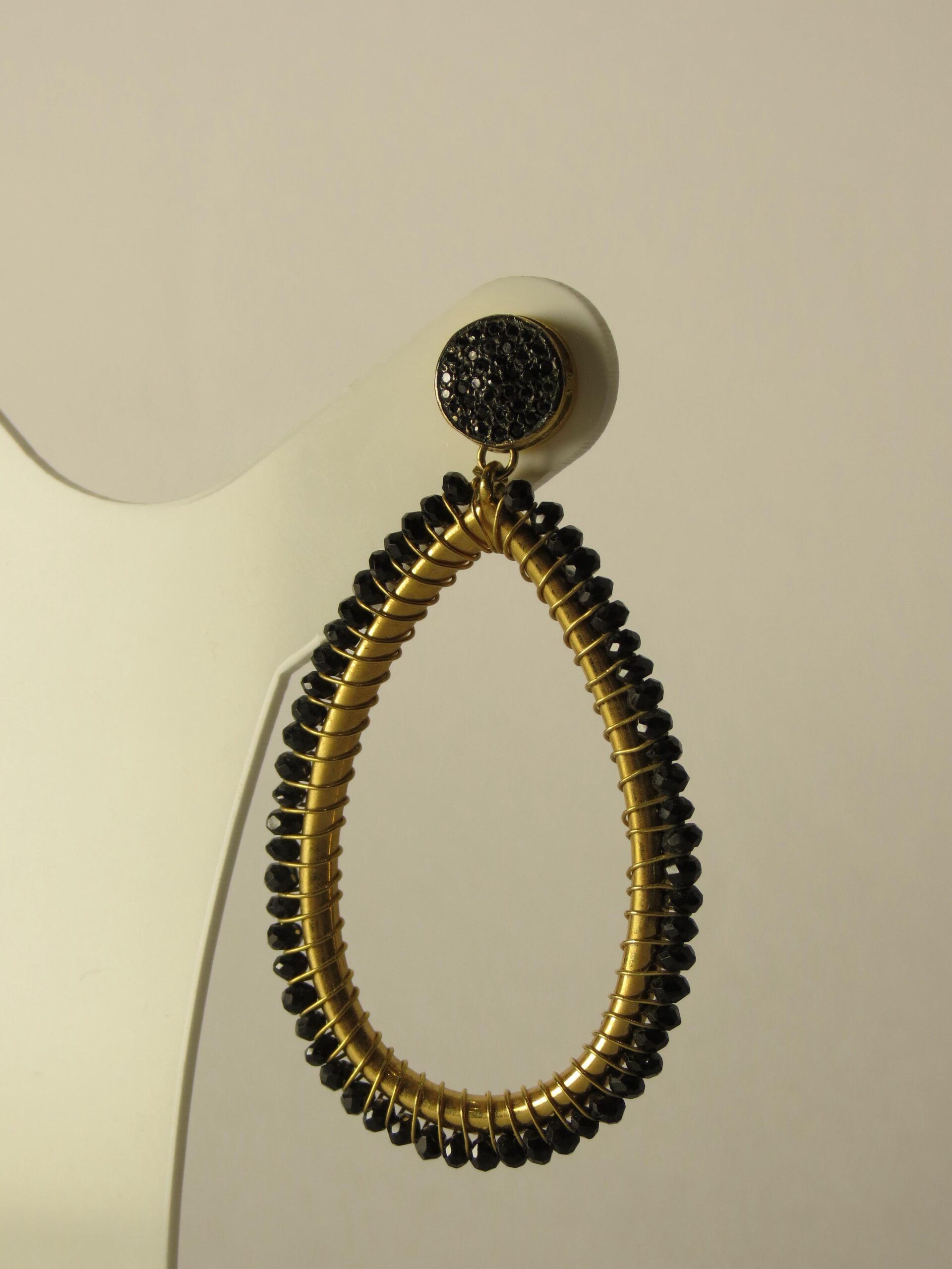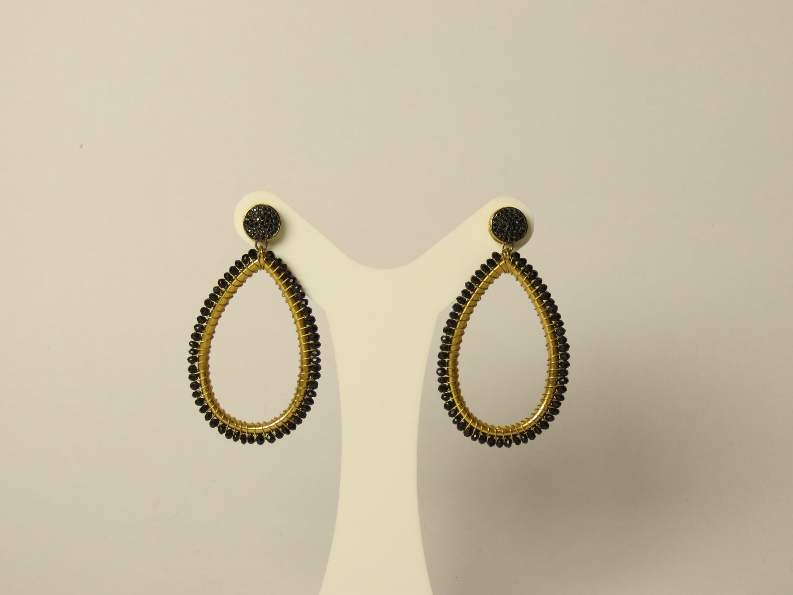 Brinco com base dourada, de 6,5 cm de comprimento. A peça possui detalhes em pedras pretas