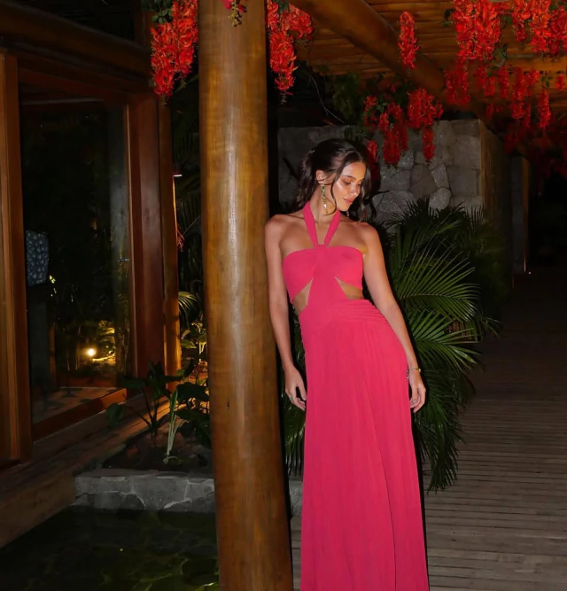 Vestido longo em tecido leve com caimento fluido e saia plissada, que traz movimento e elegância ao caminhar. O modelo possui recortes na região da cintura que valorizam a silhueta, além de cós ajustado que define o corpo com conforto.