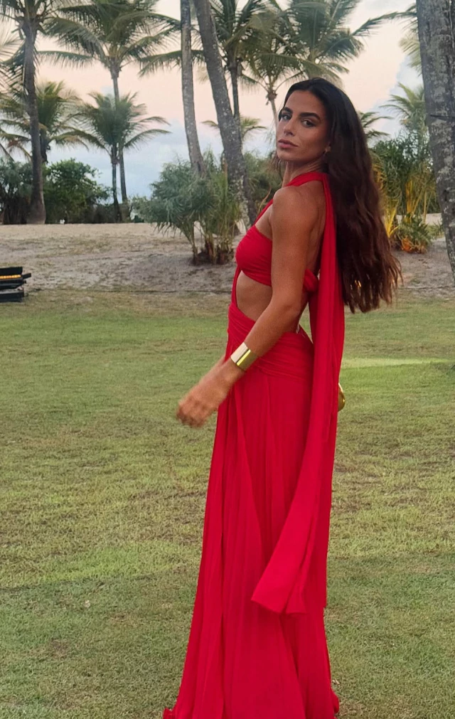 O busto é drapeado com torção central. A partir do decote, surgem duas faixas alongadas do próprio tecido, que sobem e permitem amarração no pescoço.