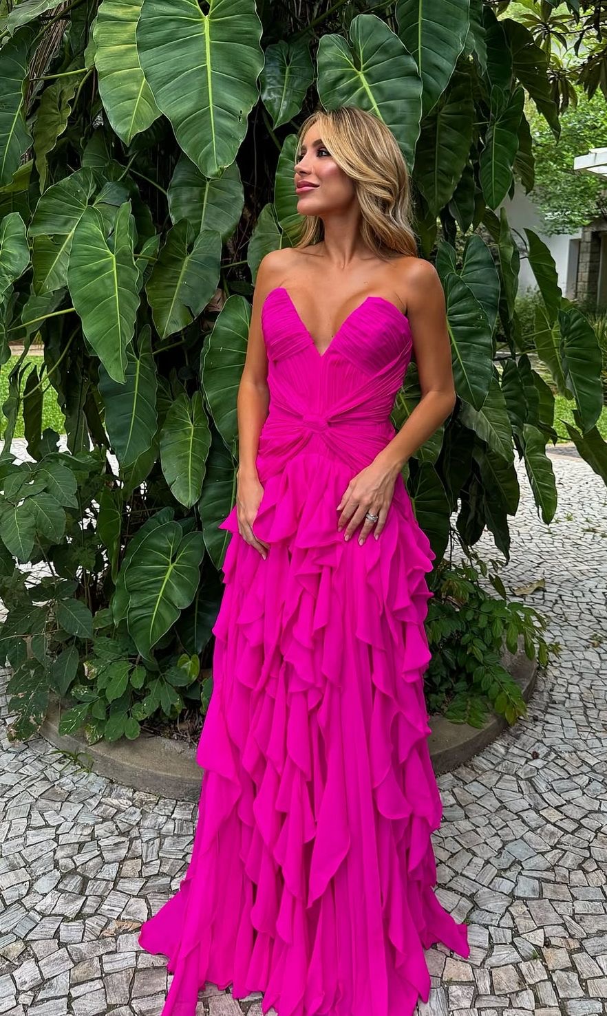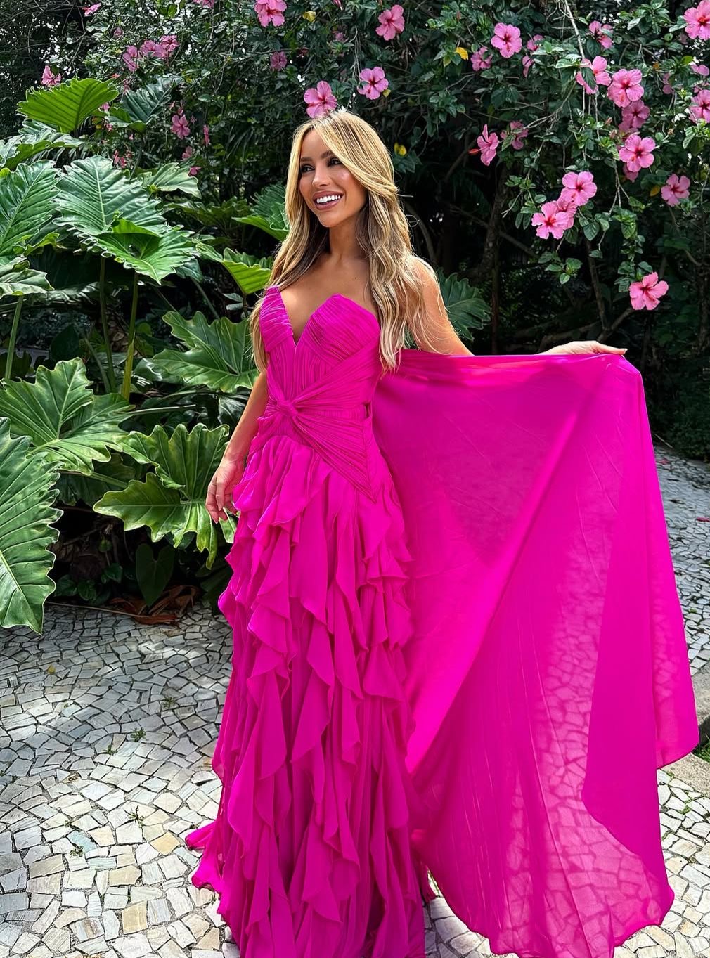 Vestido longo rosa exclusivo da marca By Duda Curimbaba, feito em tecido plissado sofisticado, com caimento leve e confortável. Modelo tomara que caia com corpete ajustado ao corpo e saia em formato evasê com camadas que proporcionam movimento. Fechamento por zíper na parte de trás.