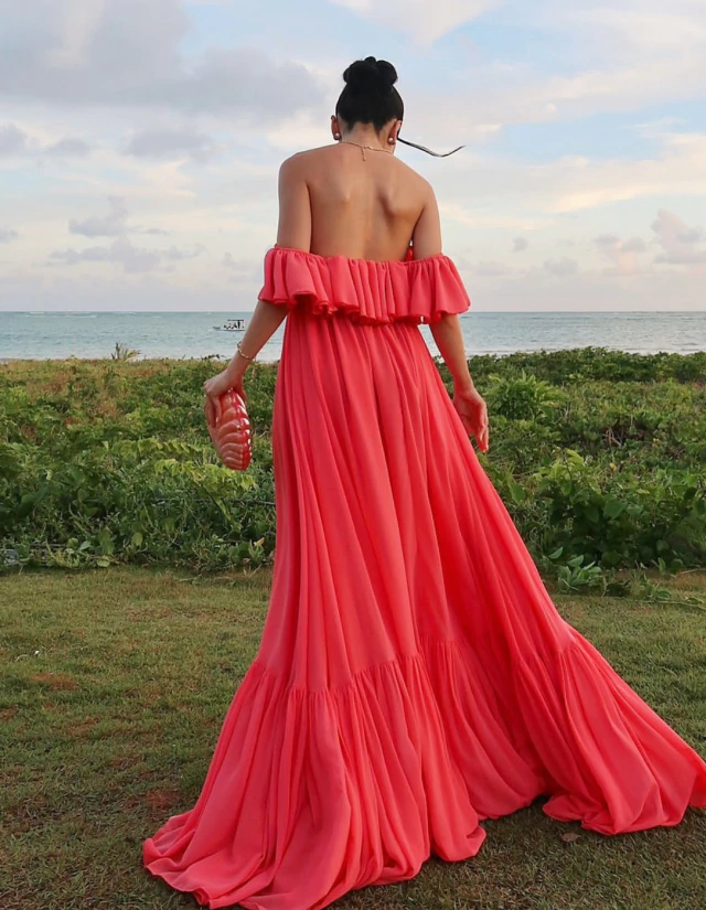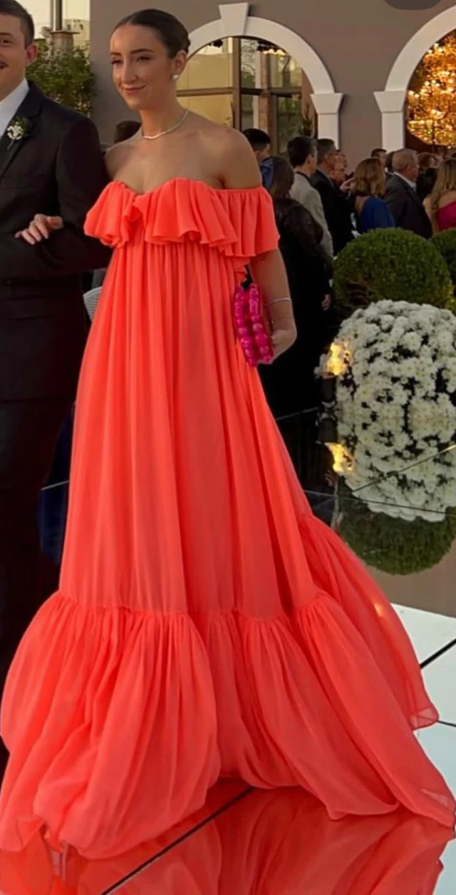 Vestido longo em tom de laranja levemente puxado para o coral, com caimento fluido e volume elegante.