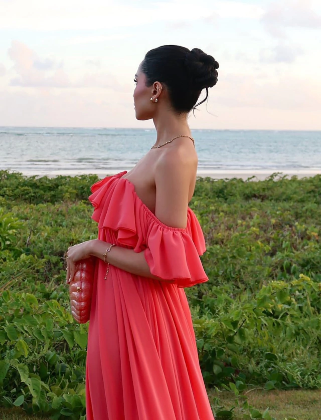 O modelo possui decote ombro a ombro com babado amplo que valoriza o colo e traz movimento à peça.