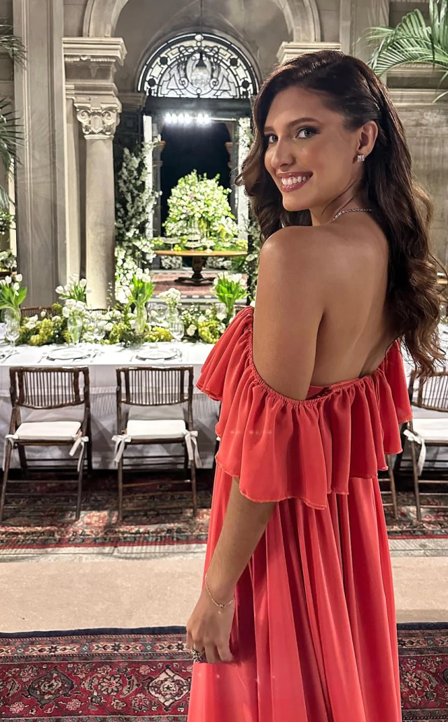 A modelagem é solta, com saia em camadas que garantem volume na medida certa e um visual delicado.