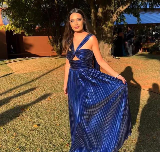 Vestido longo em azul profundo com acabamento metalizado, o brilho e textura plissada do tecido destacam a peça sob diferentes iluminações. O modelo apresenta busto estruturado com efeito torcido e drapeado, formando um recorte central abaixo do busto.