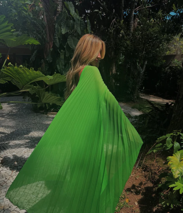 Vestido longo em tom verde intenso, vibrante e sofisticada próxima ao verde-lima mais fechado. Confeccionado em tecido leve e plissado, o modelo traz movimento fluido e caimento elegante.