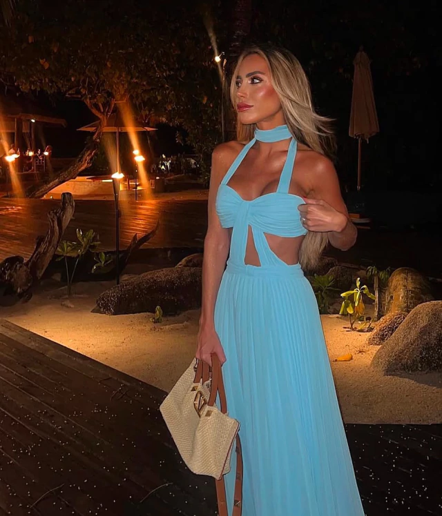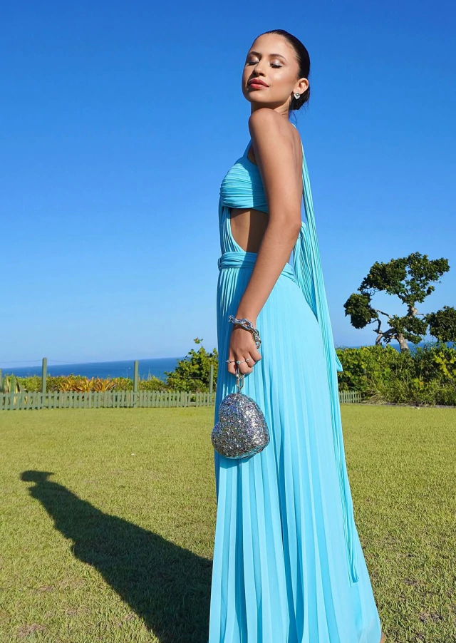 Vestido longo em tom azul claro luminoso, com leve nuance de azul piscina.