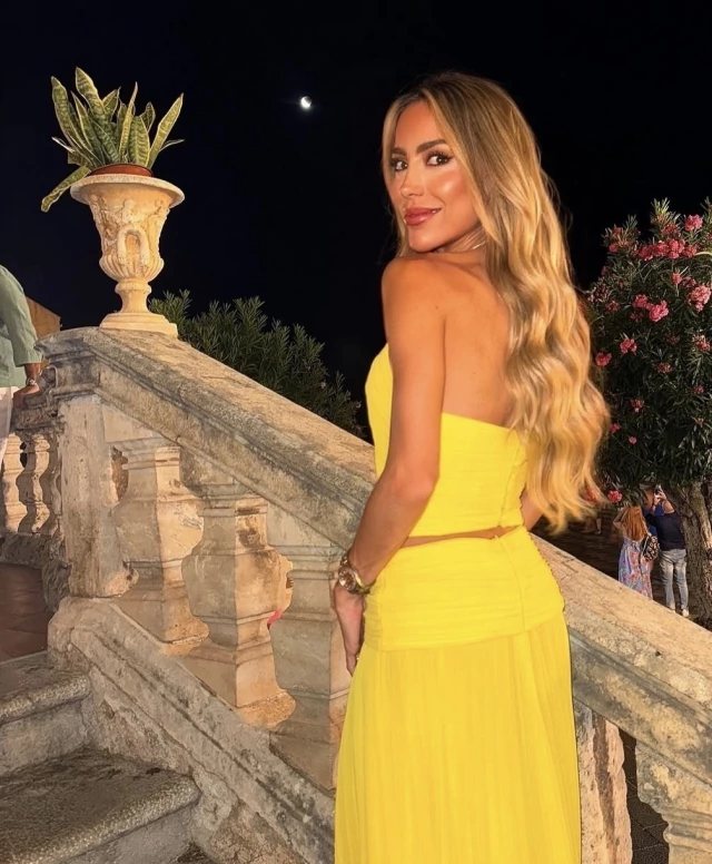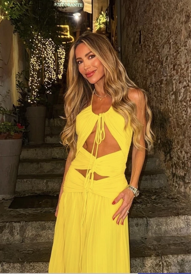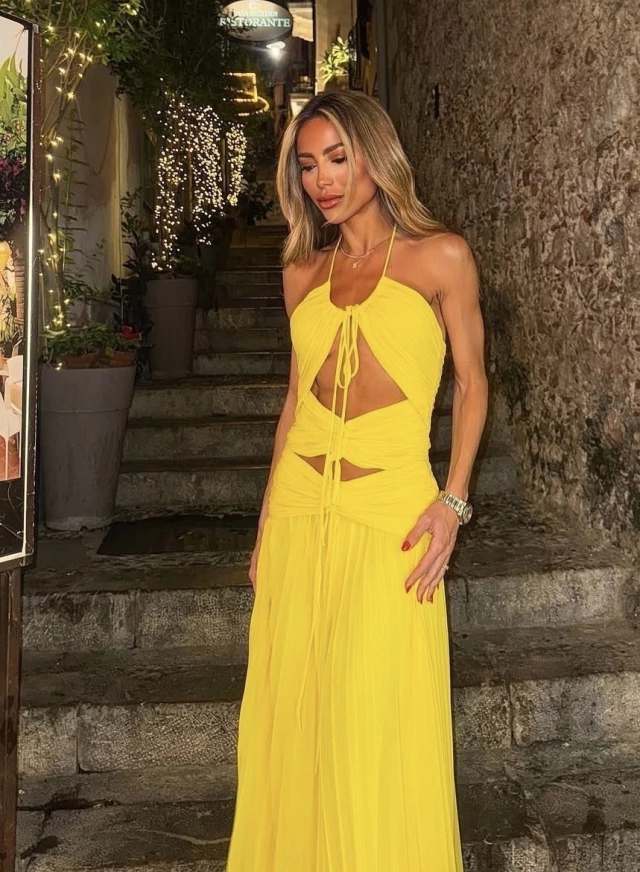 Vestido longo em amarelo vibrante. O busto é formado por tecido drapeado que se conecta por amarração central ajustável e possui decote com abertura frontal